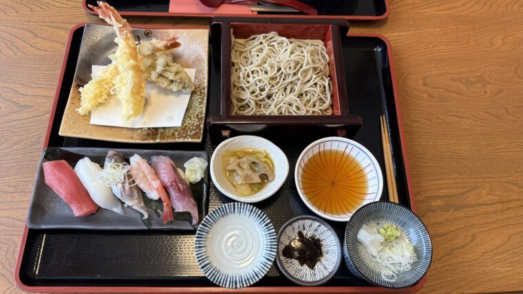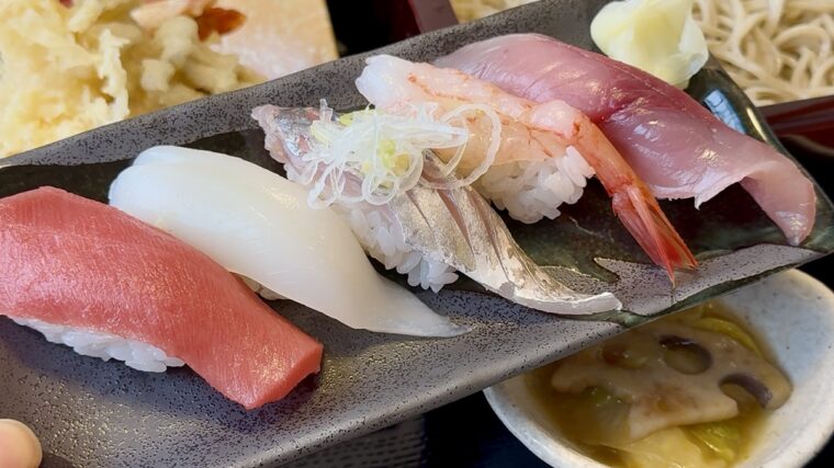 にぎり5貫、天ぷら、蕎麦が付いた贅沢なセット。