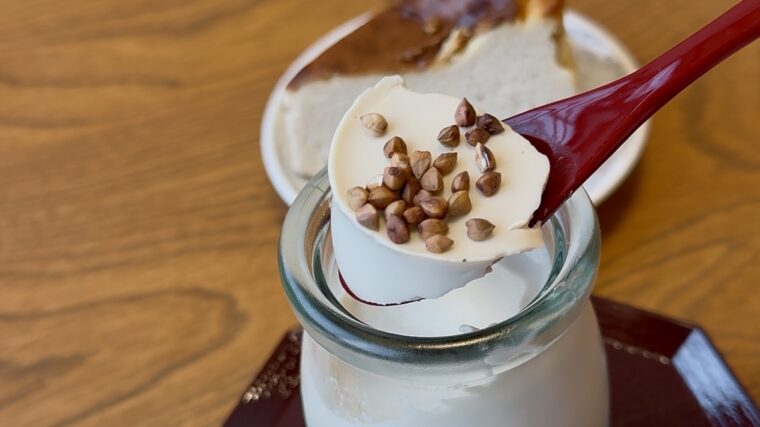 カリカリに仕上げた蕎麦の実をかけて食べる、ここでしか味わえない一品。なめらかなプリンの食感に、蕎麦の実の香ばしさと食感がアクセントになり、甘さ控えめで大人向けのデザートです。